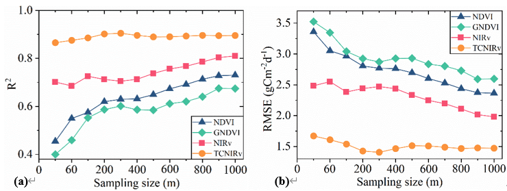 与基于通量的GPP直接比较的验证结果不仅受地形效应尺度相关性的影响,还受通量足迹的空间代表性的影响。分析发现,NDVI、GNDVI和NIRv与实测GPP之间的R2(RMSE)随通量足迹空间代表性的增大而增大(减小)。相比之下, TCNIRv在各空间代表性中相对稳定,R2最高(~ 0.9),RMSE最低(~ 1.5gCm−2d−1)。所有植被指数在千米尺度上,特别对于NIRv而言,由于地形效应得到缓解,与GPP都具有较好的一致性(图2)。