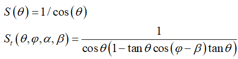 式中,Ω1和Ω2分别为太阳和观测方向;S和St分别为水平表面和倾斜表面上的路径长度,可以简单的计算为: