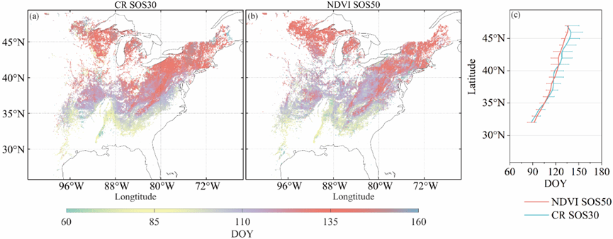 图2 大陆尺度落叶林SOS分布图:(a) CR所得结果;(b) NDVI所得结果。(c) SOS的纬度分布。