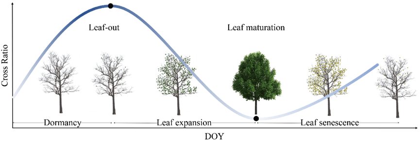 落叶林春季物候是研究气候变化对森林生态系统生物影响的重要指标。光学卫星数据质量受天气条件的影响,相比之下,微波比可见光具有更长的波长,SAR可以独立于天气条件定期获取图像,为植被物候监测提供了新的机遇。然而利用SAR数据提取物候期的研究多集中在农田上,SAR数据用于大规模森林物候提取的潜力还有待研究。此外,由SAR计算的CR与落叶林物候的物理联系尚不清楚。因此,了解CR在不同生长阶段的变化及其驱动因素具有重要意义。
