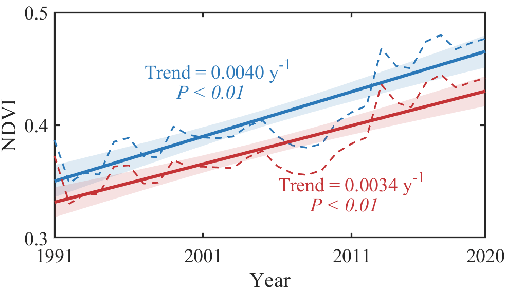 此外,1991至2020间,南北坡的 NDVI均增加,但北坡增幅大于南坡,即北坡植被在气候变化中受益更多。
