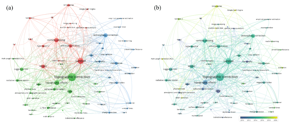 关键词共现网络分析结果直观地揭示了遥感观测(红色集群),地形校正方法和数字高程模型(绿色集群),以及地形校正应用(蓝色集群)的相互关系(图4)。关键词的时间趋势也表明未来的地形校正研究更趋向于基于物理的地形校正方法开发和基于google earth engine云平台的时间序列分析等。