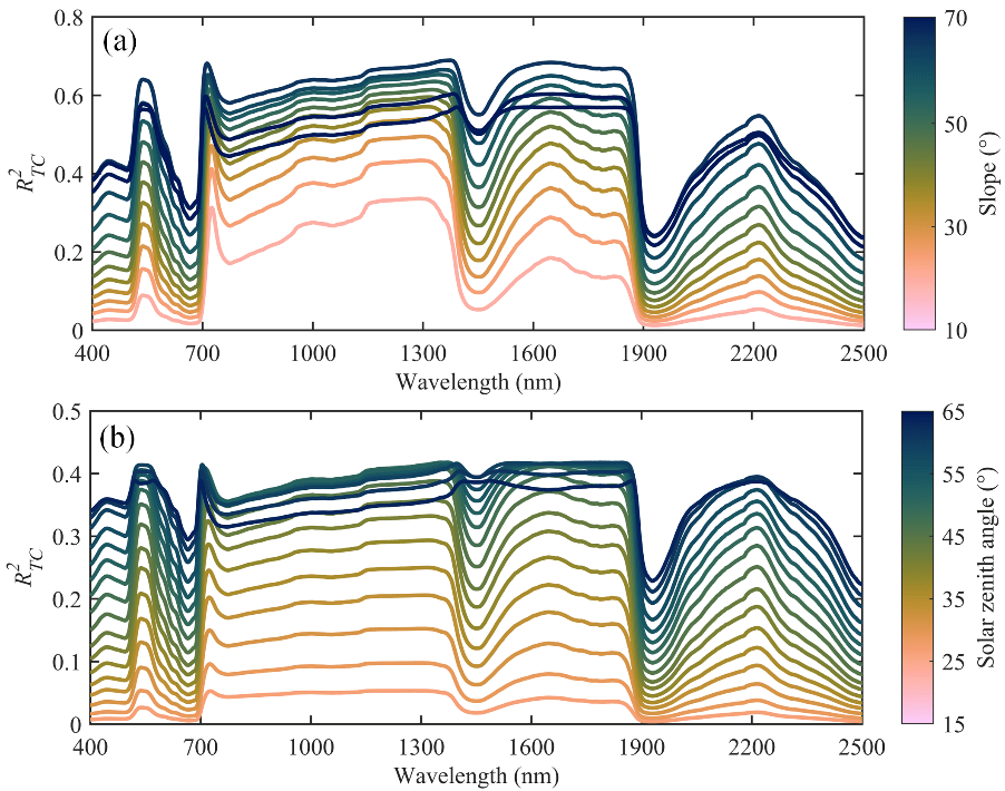 本研究基于PLC模型探究了地形对400-2500 nm波段反射率和植被指数的影响,同时量化了地形对LAI反演影响的大小。结果表明,坡度和坡向扭曲了反射率的角度分布。随着坡度和太阳天顶角的增大,地形效应明显增强;地形对光谱反射率的影响随后会影响VI进而影响LAI的反演精度。这些发现揭示了地形对山区遥感观测和LAI反演的影响,可为地形校正的应用提供科学依据。