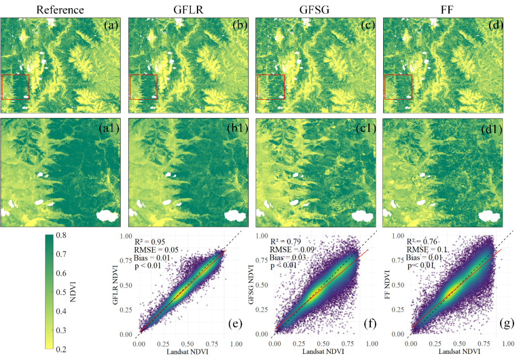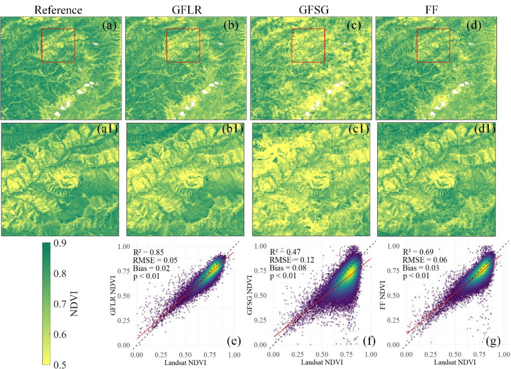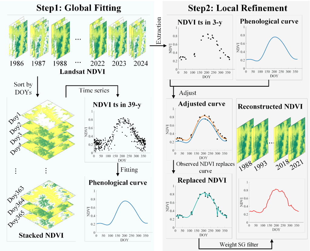 山区具有高度复杂的微气候环境,孕育了丰富的植被多样性,对植被动态的精准监测对于生物多样性保护具有重要意义。高分辨率归一化植被指数(NDVI)是刻画植被时空变化的关键指标,但在多云山区,由于长期云覆盖和显著的空间异质性,NDVI重建面临较大挑战。本研究在Google Earth Engine(GEE)平台上开发了一种全局拟合与局部优化(Global Fitting and Local Refinement,GFLR)方法,用于重建Landsat NDVI。该方法首先利用近40年的像元级NDVI时序进行全局拟合,构建稳定的物候基准曲线。随后利用3年滑动观测窗口进行局部优化,以刻画植被动态。与现有常用重建方法相比,GFLR在精度上表现更优,且在不同云覆盖和地形复杂度条件下均表现出较强的稳健性。因此,基于GFLR的NDVI产品为复杂多云山区植被动态研究提供了可靠且稳健的数据支持。为促进方法的可重复性与应用推广,GFLR的完整代码已公开,可通过以下链接获取:https://code.earthengine.google.com/faf7a2d54025d0069bbe936dea313da8。该成果近期发表于中科院一区期刊Global and Planetary Change。