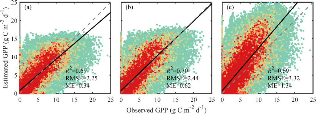 三种模型均采用双流近似方法模拟冠层或叶片吸收的辐射,并统一使用FvCB叶片光合作用模型。在全球167个涡度协方差观测站点上,我们基于站点观测和遥感数据,采用三种模型估算小时尺度的GPP,并通过比较不同模型估算的GPP差异,量化冠层分层策略对GPP估算的影响。