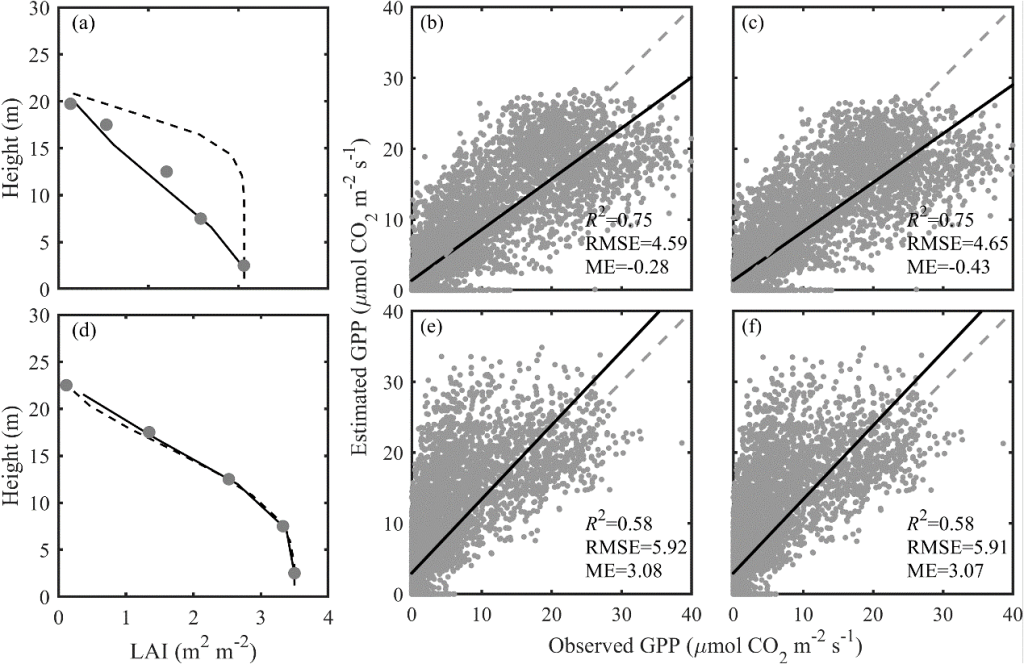 MTL模型可以模拟光合作用速率的垂直变化,进而捕捉光合作用对环境变化响应的垂直异质性。在US-xSE(38.89°N, 79.56°W)和US-Ho1(45.20°N, 68.74°W)站点的进一步分析表明,当采用beta函数模拟的叶面积垂直分布廓线与GEDI观测的廓线更加一致时可以提高多层模型模拟GPP的精度。